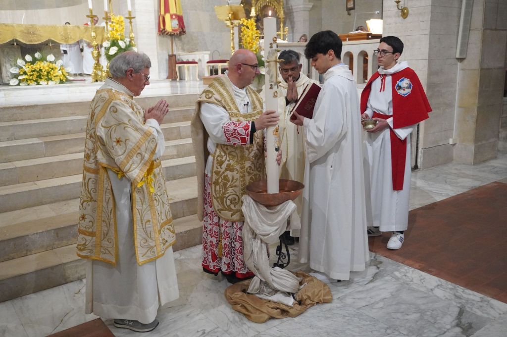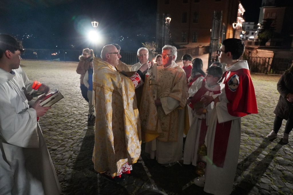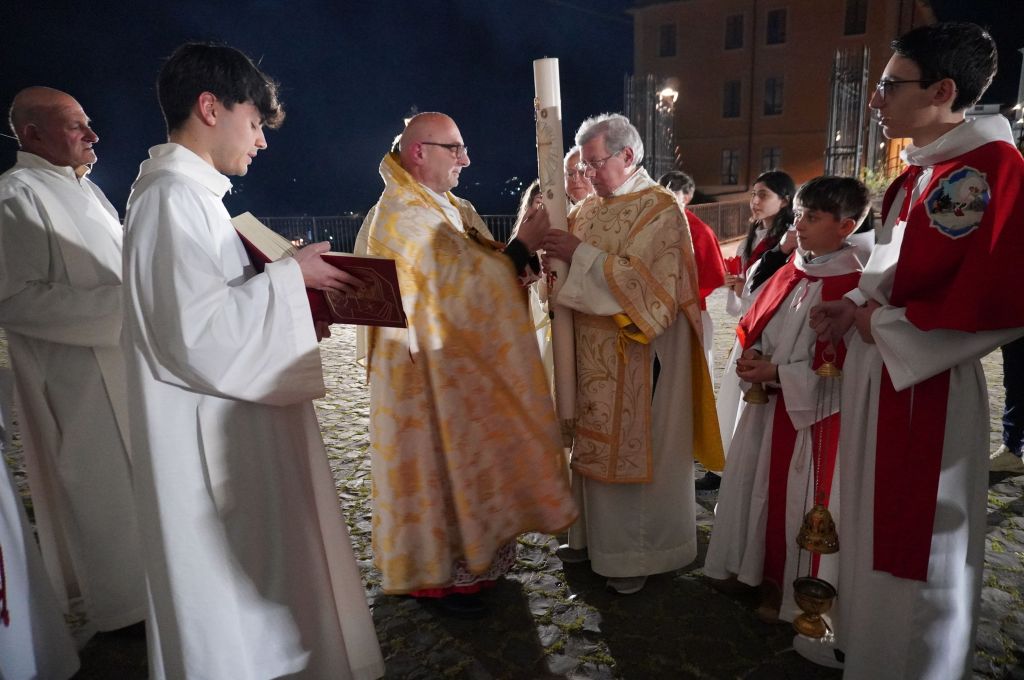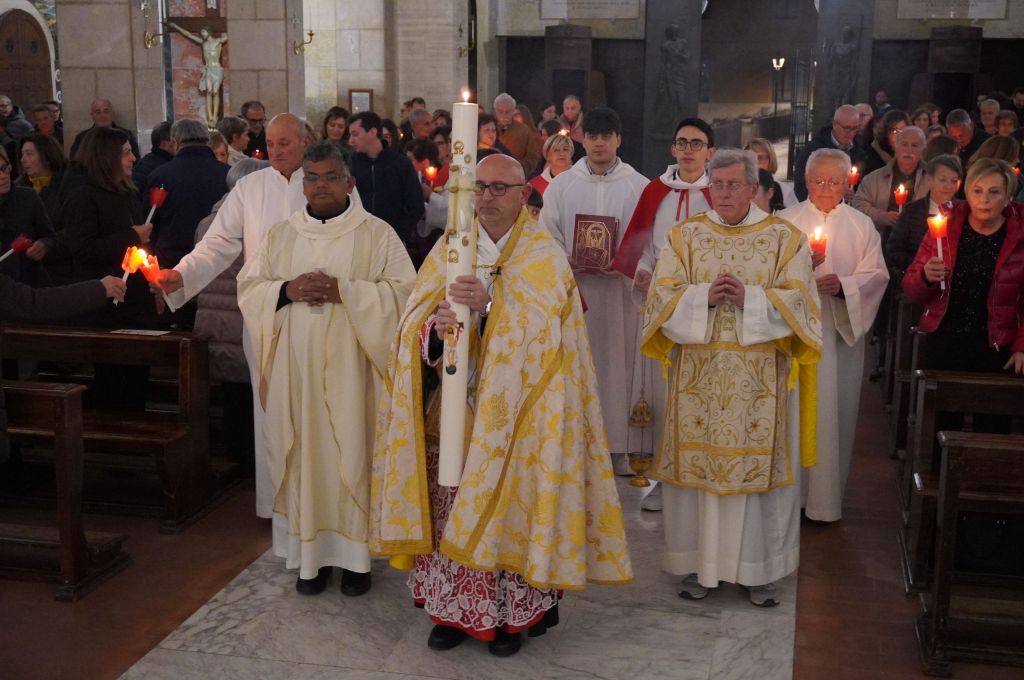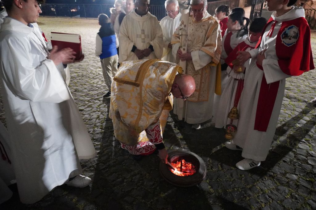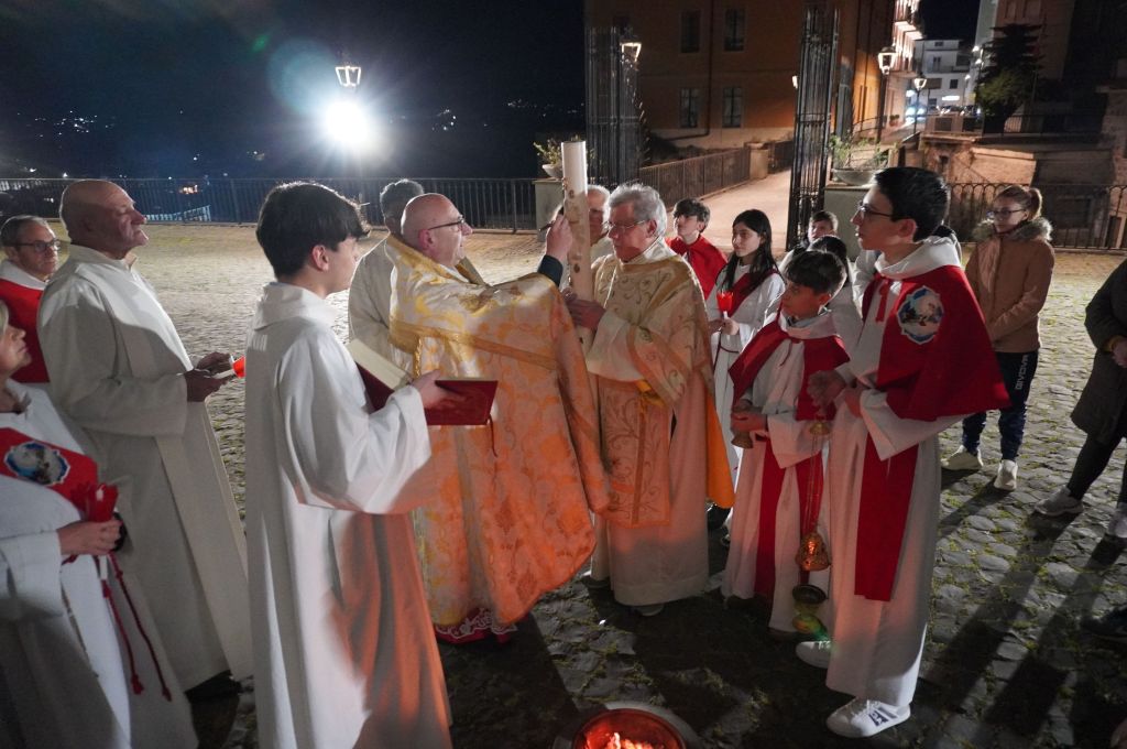 La Veglia Pasquale comincia così, con la benedizione del fuoco sul sagrato della chiesa, e con il fuoco benedetto si accende il cero pasquale, e con la brace si prepara il turibolo per l’incenso. Il tutto con la recita delle preghiere di rito. Si entra poi nella chiesa immersa nell’oscurità e rischiarata solo dalla fioca luce del cero pasquale proclamando “Cristo luce del mondo”. Giunti sull’altare si canta l’Exultet e si proclama la Liturgia della Parola. Con il canto del “Gloria” inizia la Solenne Celebrazione Eucaristica con il rito della benedizione dell’acqua.