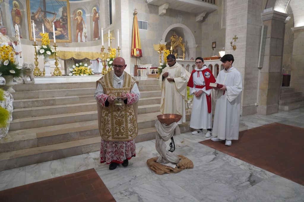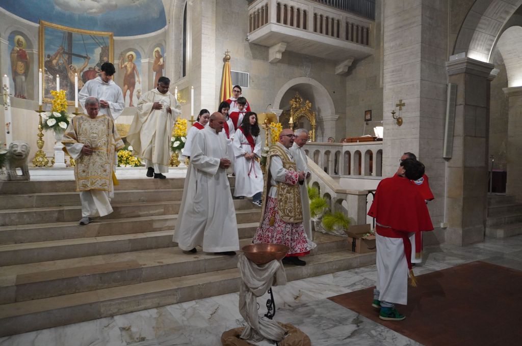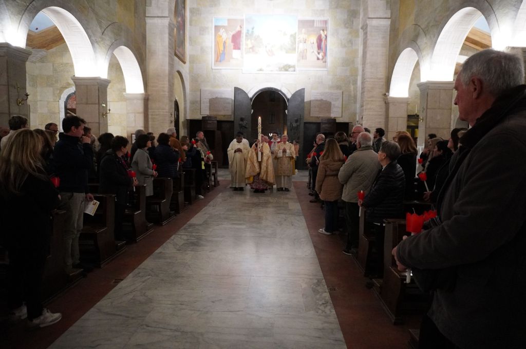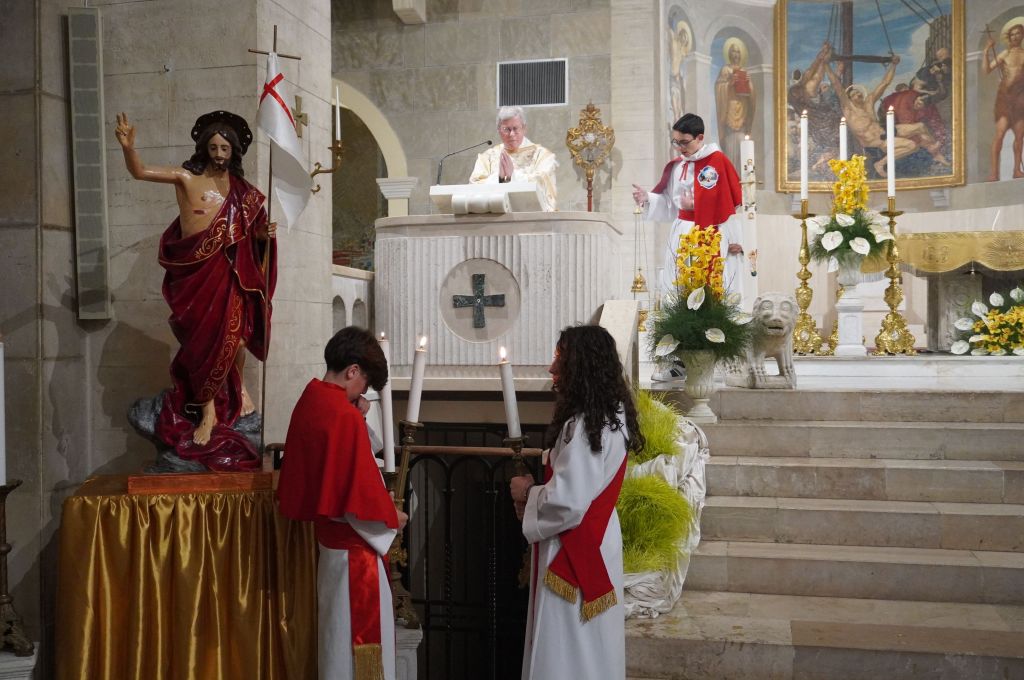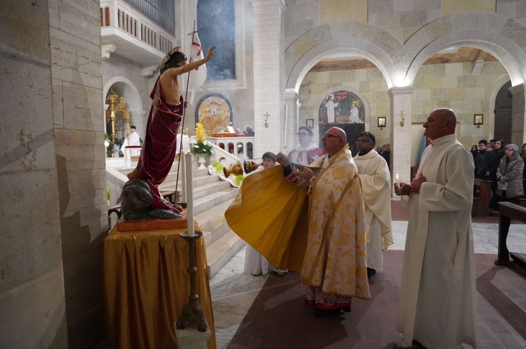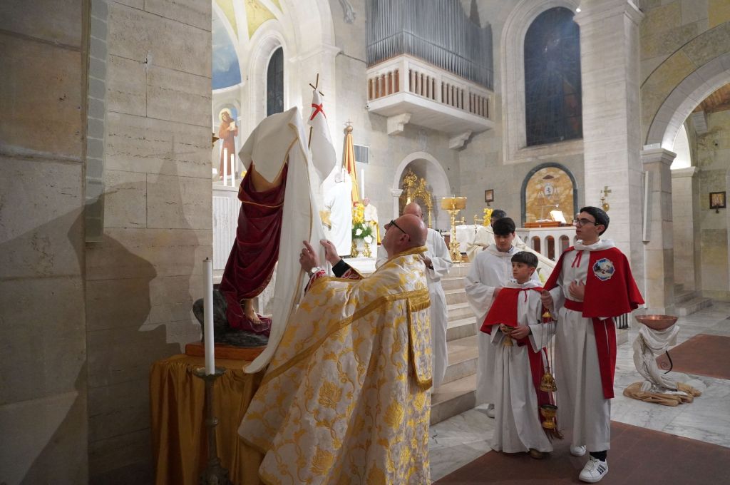 La Veglia Pasquale comincia così, con la benedizione del fuoco sul sagrato della chiesa, e con il fuoco benedetto si accende il cero pasquale, e con la brace si prepara il turibolo per l’incenso. Il tutto con la recita delle preghiere di rito. Si entra poi nella chiesa immersa nell’oscurità e rischiarata solo dalla fioca luce del cero pasquale proclamando “Cristo luce del mondo”. Giunti sull’altare si canta l’Exultet e si proclama la Liturgia della Parola. Con il canto del “Gloria” inizia la Solenne Celebrazione Eucaristica con il rito della benedizione dell’acqua.
