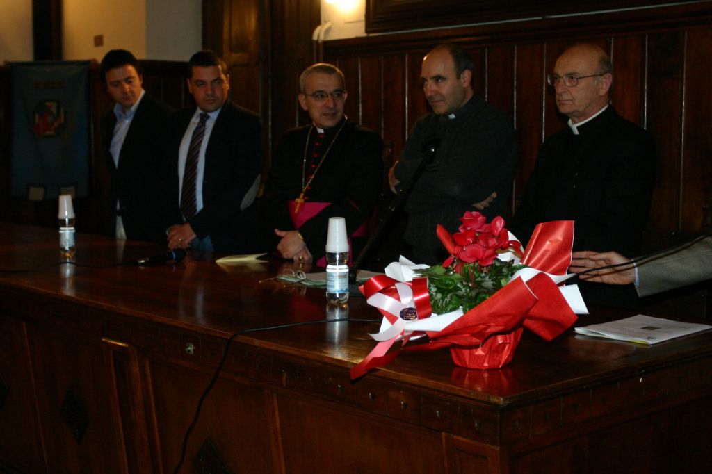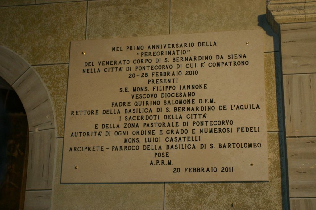 Nei giorni 19 e 20 febbraio si sono svolte le celebrazioni per il primo anniversario della “Peregrinatio” di San Bernardino da Siena a Pontecorvo. Rileviamo la conferenza del prof. Felice Accrocca, della Pontificia Università Gregoriana, nella sala comunale; le varie celebrazioni religiose con il nostro Vescovo in Cattedrale; e, sempre in Cattedrale, la presentazione del volume “Atti della Peregrinatio di San Bernardino a Pontecorvo” a cura di Luigi Casatelli e Angelo Molle. Dopo la conferenza, è stata inaugurata la lapide commemorativa posta all’interno della Cattedrale.