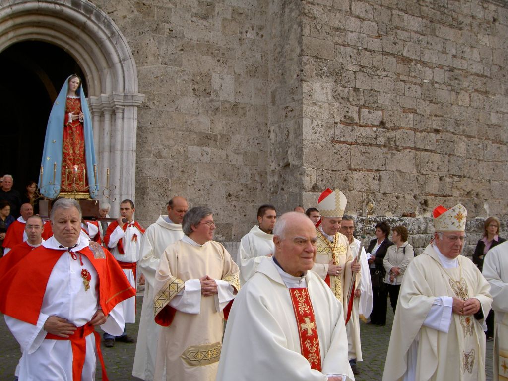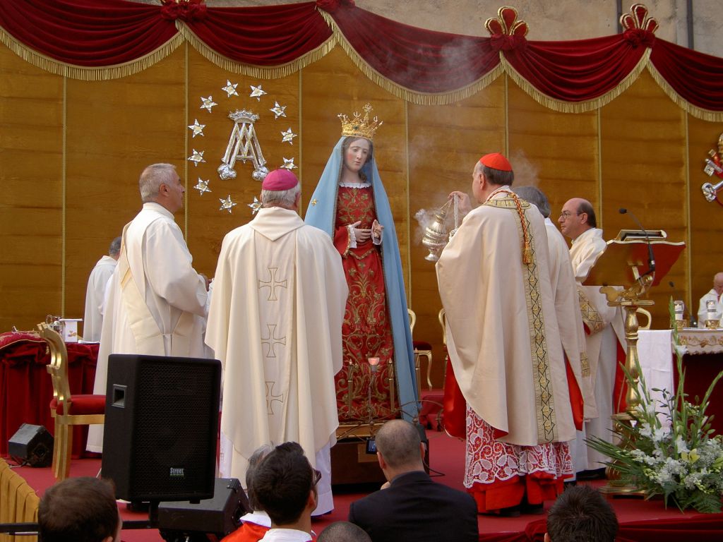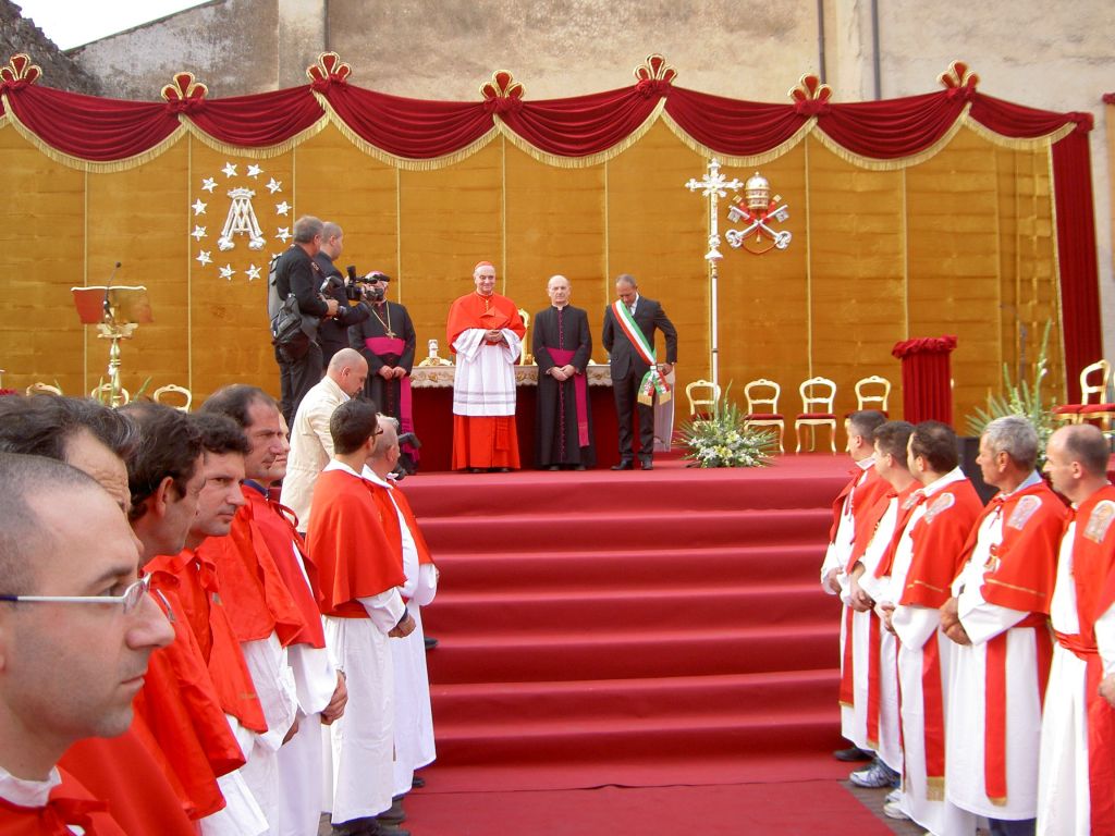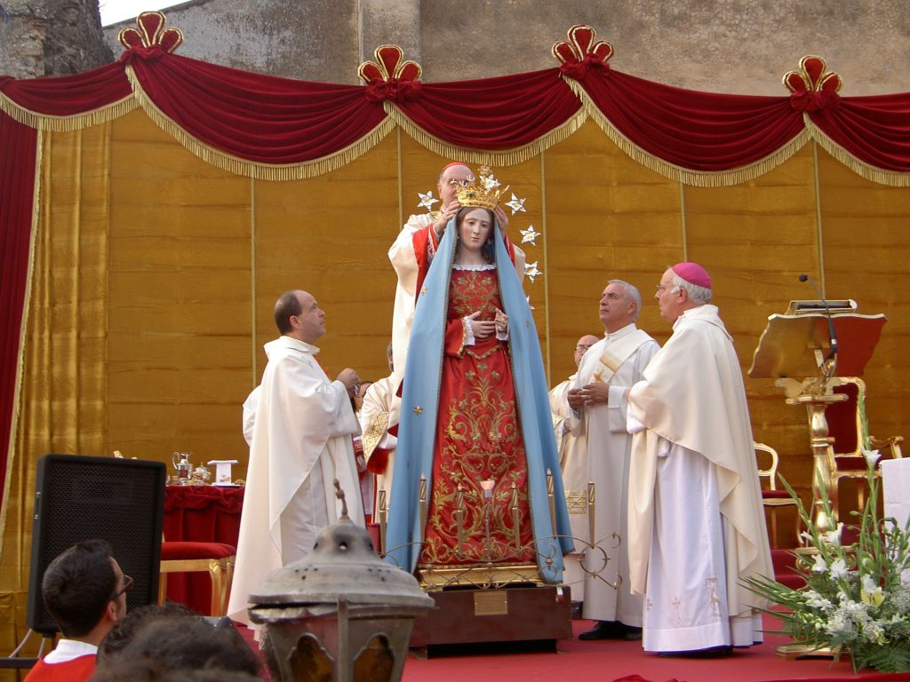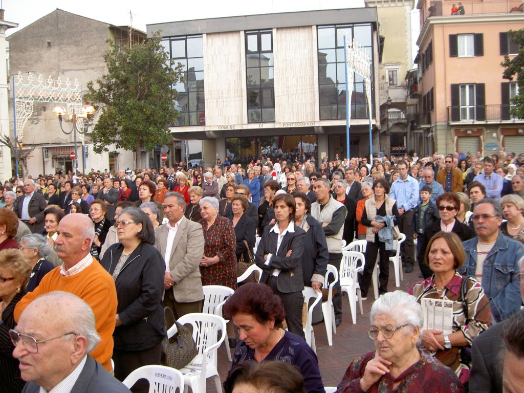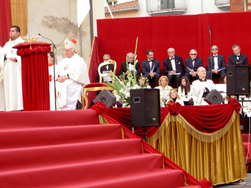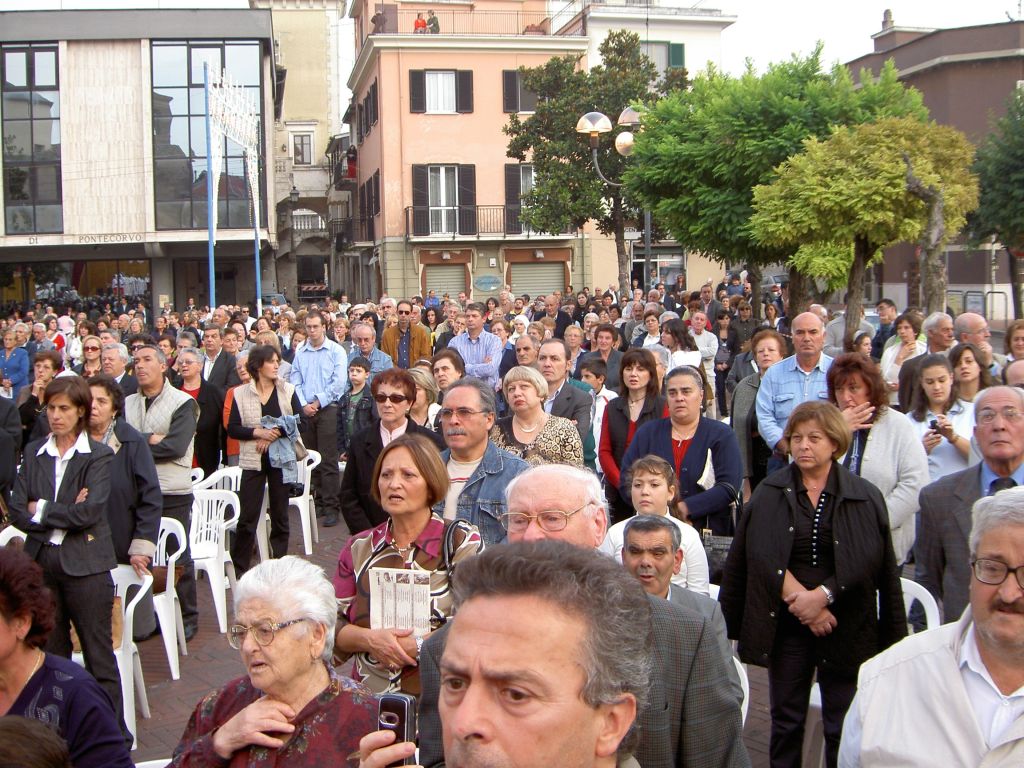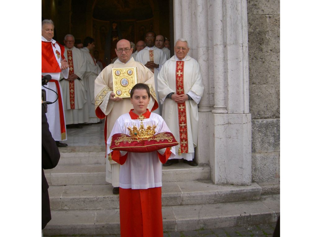 Il gesto di porre la corona aurea sul capo della Madonna vuole essere come la restituzione dell’antica corona che fu rubata alcuni anni fa da mani ignote. Nell’archivio della Cattedrale c’è una immaginetta, donata dal dott. Massimiliano Maglione, raffigurante la Madonna adornata con una corona di stile imperiale. La cerimonia è iniziata con la processione della statua della Madonna dalla Cattedrale fino a piazza A. De Gasperi, dove è stato allestito un palco per la celebrazione della Santa Messa, presieduta da S.E.Card. Angelo Comastri, con il Vescovo Mons. Luca Brandolini e con tutti i sacerdoti della città e della zona pastorale di Pontecorvo. Durante la celebrazione, con il rito della incoronazione, il Card. Comastri ha posto la corona sul capo della statua della Madonna. Al termine, dopo una breve processione per le vie del centro, la statua è rientrata in Cattedrale. La corona, in oro e pietre preziose, è stata realizzata con il contributo di tanti fedeli sia in denaro che con loro oggetti d’oro.