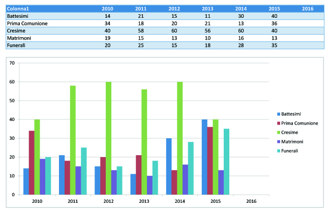 Nella tabella sono riportati i dati statistici dal 2010 al 2015 delle principali celebrazioni religiose della Parrocchia.