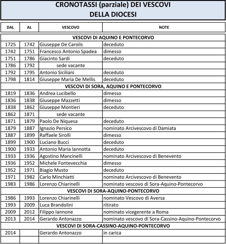 Le Diocesi di Sora (sec. III), Aquino (sec. V), Pontecorvo (sec. XVIII), già unite “aeque principaliter” il 27 Giugno 1818, sono state unificate il 30 settembre 1986 con la denominazione di “Diocesi di Sora Aquino Pontecorvo”.