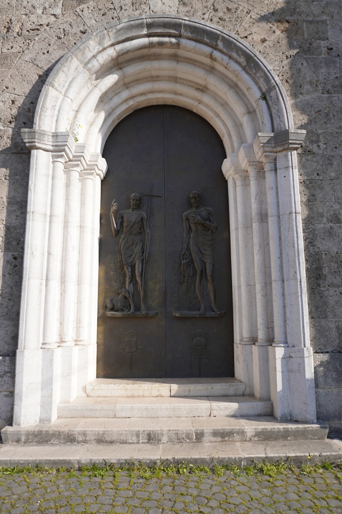 Le porte di bronzo della facciata principale sono state progettate dallo scultore Guglielmo Savini e realizzate dalla Domus Dei di Roma. vennero benedette il 29 settembre 1995 da Mons. Luca Brandolini, l’allora Vescovo diocesano. Sulla porta maggiore sono raffigurati San Giovanni Battista e San Bartolomeo Apostolo; sulla porta minore sono raffigurati due santi locali San Grimoaldo, sacerdote e già arciprete della collegiata di San Bartolomeo nel secolo XII, ed il Beato Grimoaldo Santamaria, Passionista.