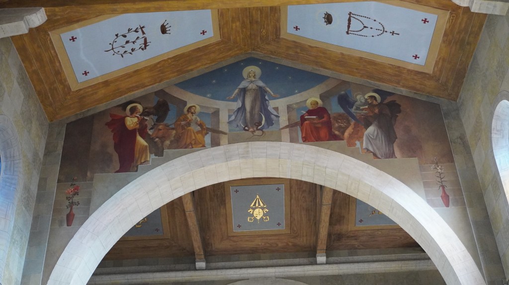 Sull’arco trionfale è raffigurata l’Immacolata Concezione con ai lati gli Evangelisti accompagnati dai rispettivi simboli iconografici: San Matteo con l’angelo, San Marco con il leone, San Luca con il bue, San Giovanni con l’aquila.