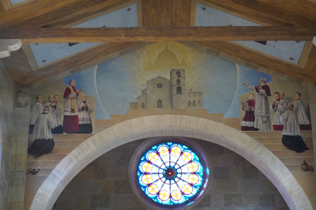 Sull’arco d’ingresso, dalla parte dell’altare, si ammira la facciata della Cattedrale di San Bartolomeo su uno sfondo sfumato della Basilica di San Pietro. Alla destra prendono posto il Papa Pio XII, il Cardinale Benedetto Aloisi Masella e i prelati pontifici; alla sinistra vi sono il vescovo diocesano Mons. Biagio Musto, gli arcipreti Turchetta e Vano con i Canonici della Cattedrale.