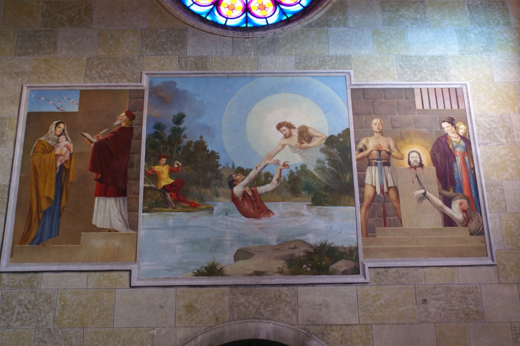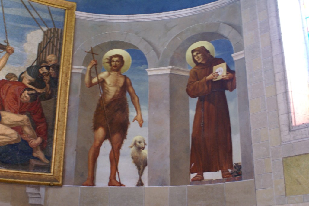 Sulla controfacciata, al di sotto del rosone, è dipinto un trittico dedicato al patrono San Giovanni Battista.
