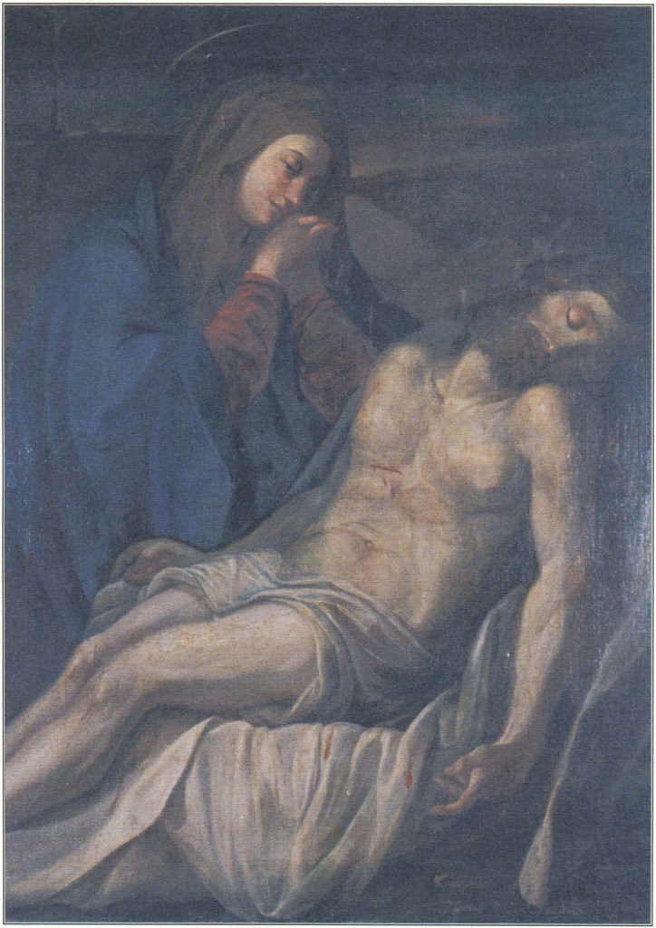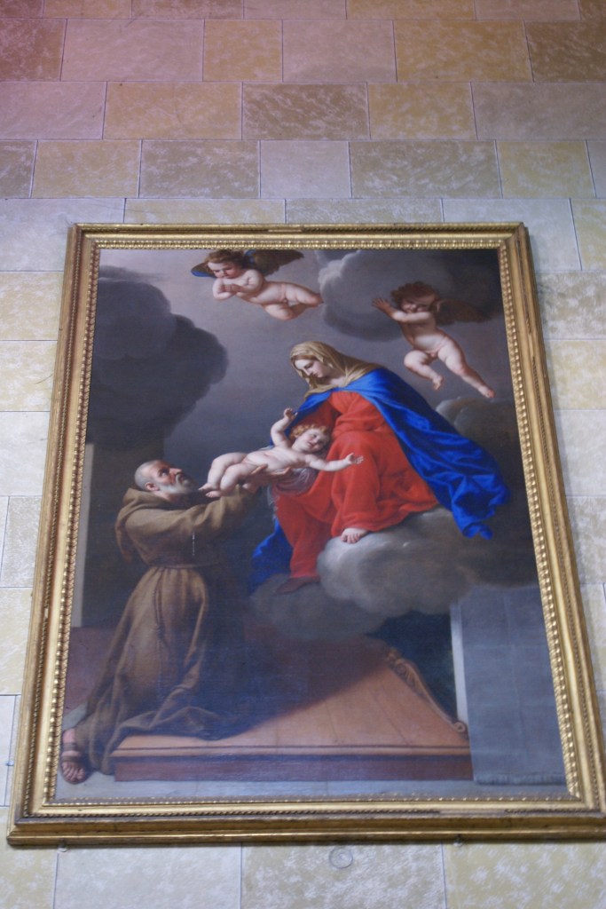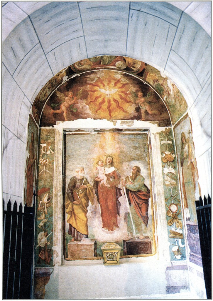 Un cenno a parte merita l’affresco ospitato nella cappella che una volta ospitava il fonte battesimale. Si tratta di un’opera molto importante recuperata dalla chiesa detta Canonica che rappresenta l’Immacolata Concezione con il bambino in braccio e ai lati i SS. Pietro e Paolo, attribuito al pittore cassinese Marco Mazzaroppi (1550-1620).