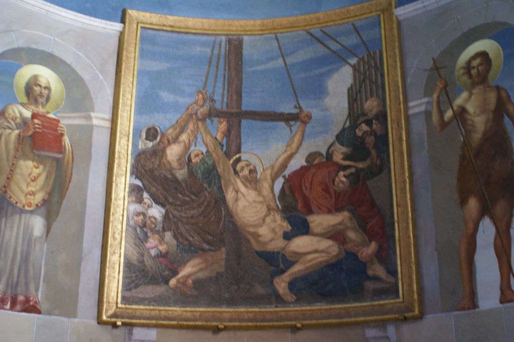 Nell’abside trova posto il mosaico comunemente considerato il Martirio di San Bartolomeo. Realizzato dalla Scuola Vaticana nel 1951, dono del Papa Pio XII, in realtà è la fedele riproduzione di un dipinto dell’artista Jusepe de Ribera, detto “Lo Spagnoletto”, rappresentante il Martirio di San Filippo. L’originale è conservato al Museo del Prado a Madrid.